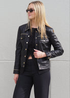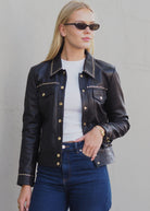 The classic jean jacket style is upgraded in soft and buttery leather. The gold studs add a touch of bling
