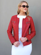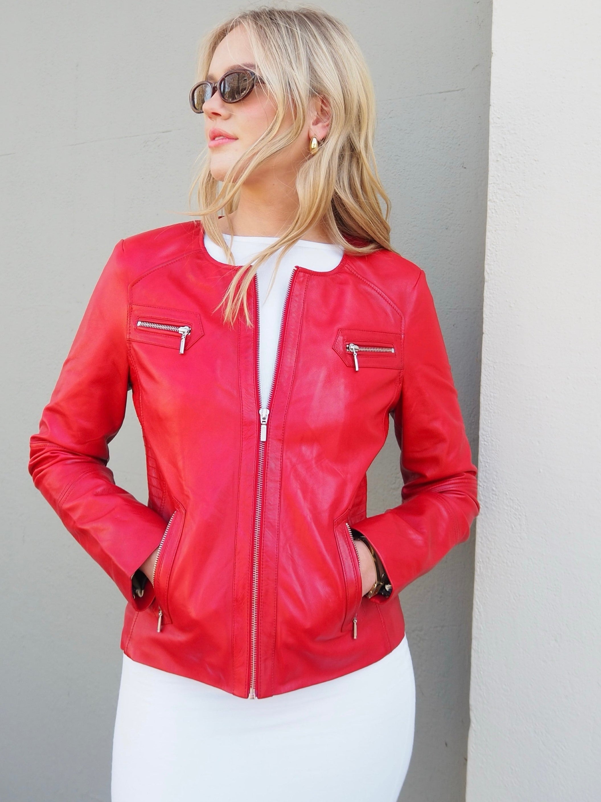 The New York jacket is a classic style with an edgy twist, perfect for day to nightwear. It's made of super-soft leather, and it features 4 functional zip pockets on the front, semi-structured shoulders and stitch detailing on the side panels. The New York jacket is the perfect companion to all your wardrobe staples, as it transitions beautifully from day to night- wear it with your favourite jeans, or the perfect Saturday night party dress.