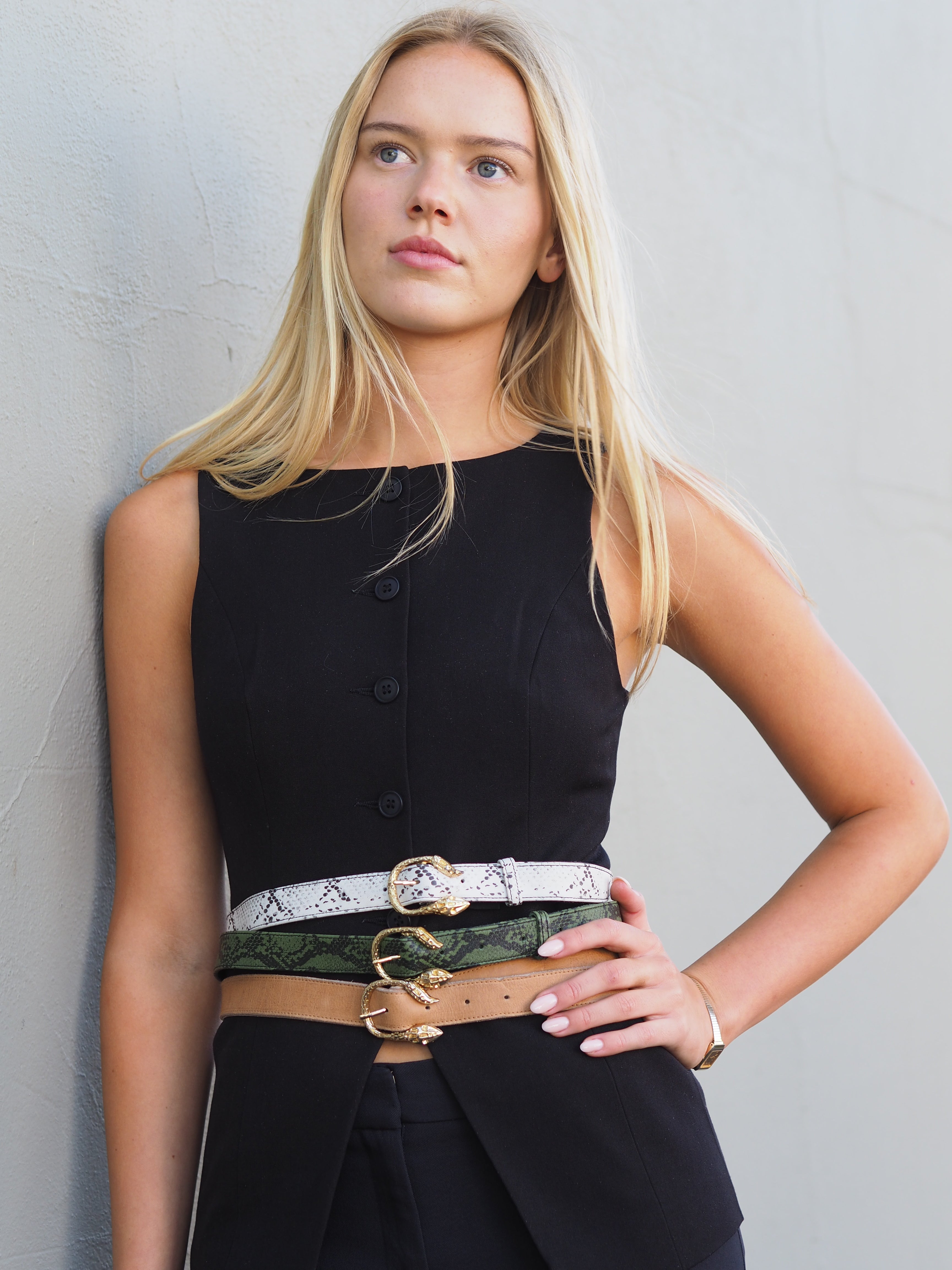 An eye-catching gold snake buckle makes this belt a great investment piece