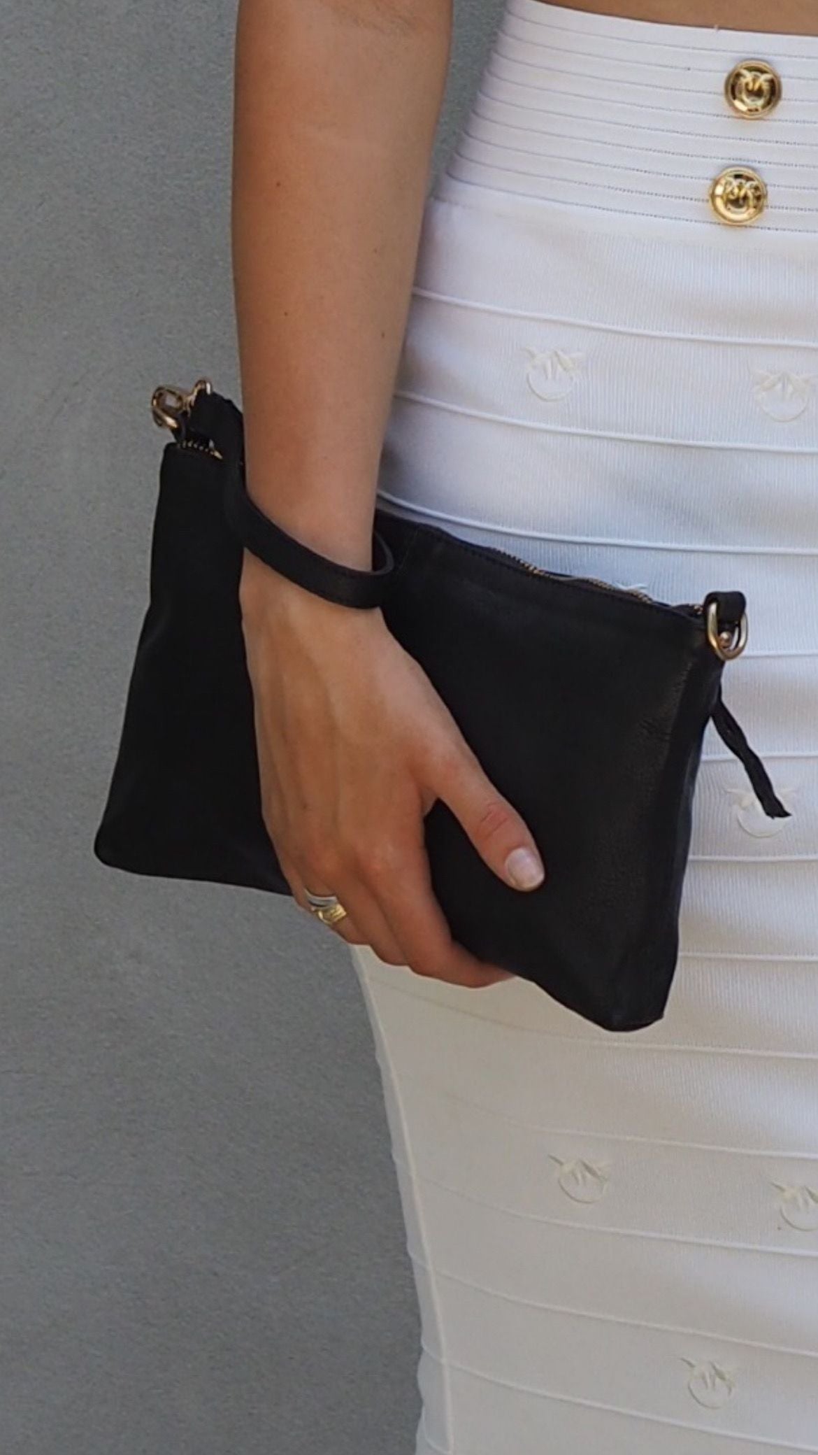 -An adjustable strap that can be removed as well as a wristlet straplet so it can be worn as a clutch