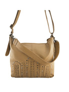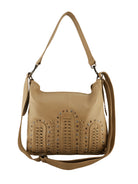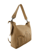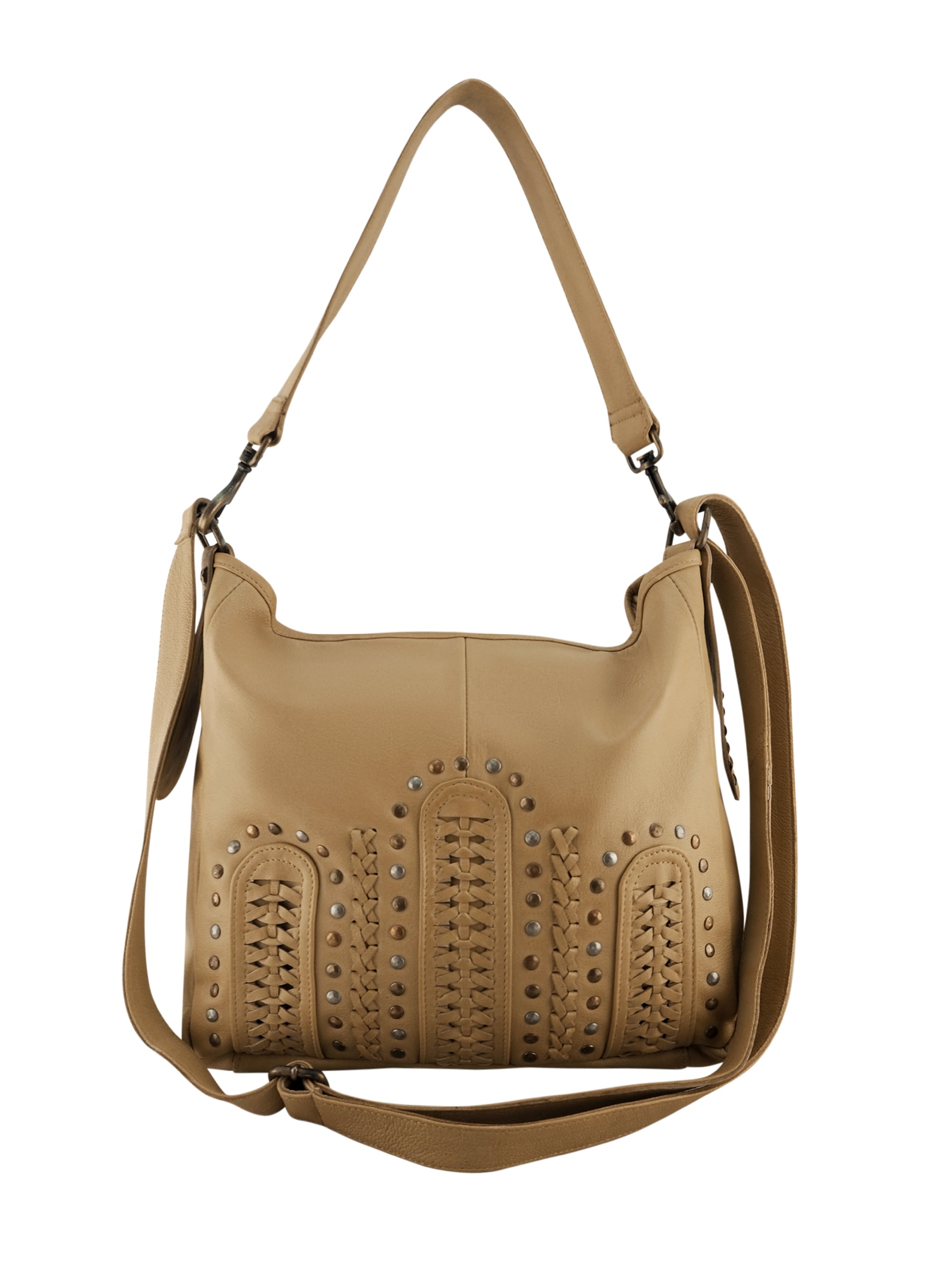 - Hand braided panels on the front are highlighted with cross stitching and outlined with an array of antique coloured studs in various shades